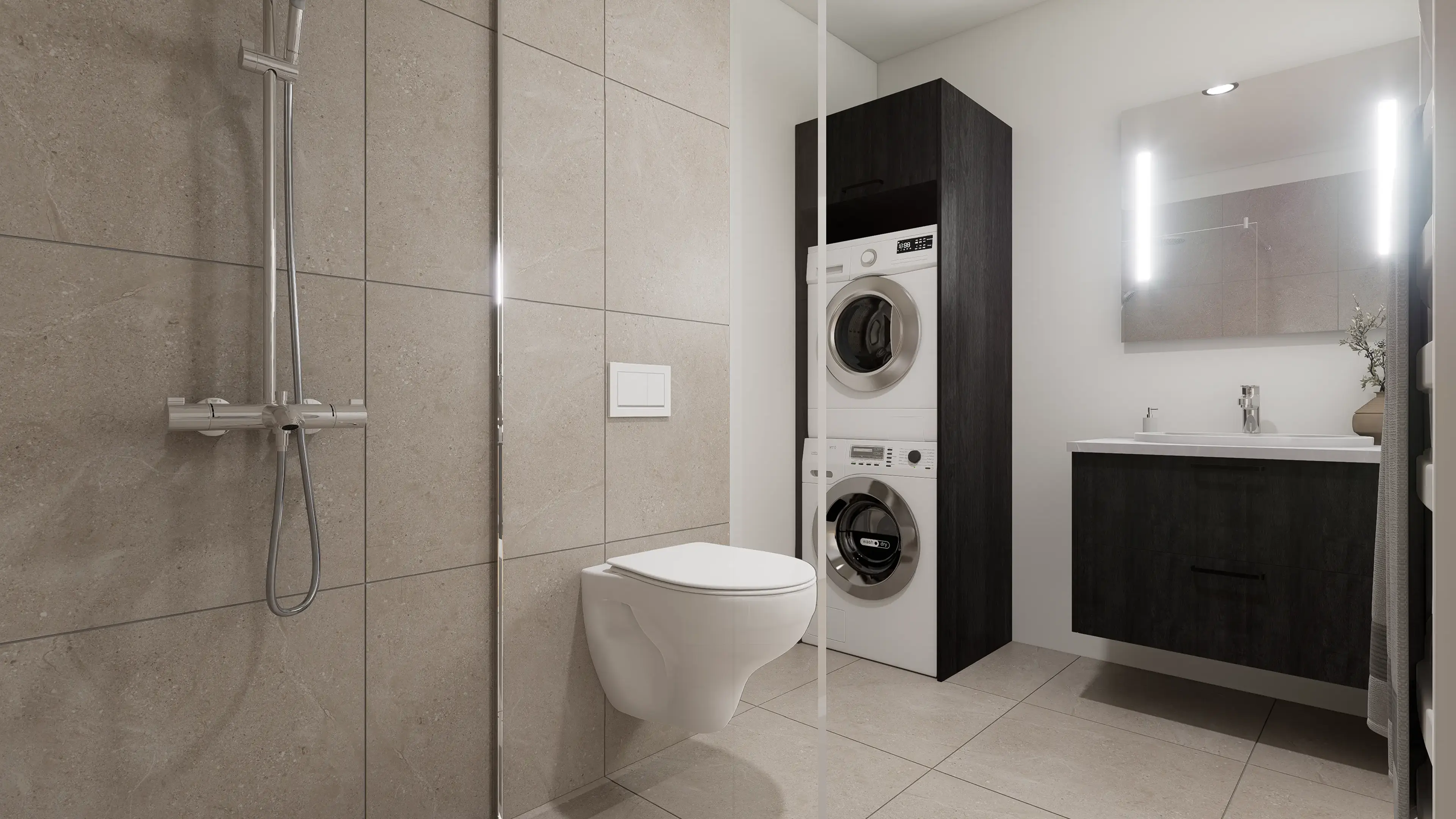 Undir húsunum er rúmgóður bílakjallari með 62 sérmerktum stæðum. Innkeyrsla er með fjarstýrðri hurð og beint innangengt úr kjallaranum í stigahús og lyftur.